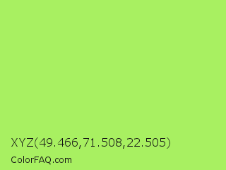 XYZ 49.466,71.508,22.505 Color is a light green color and the nearest color is Inchworm #b2ec5d. Hex code #a8f061 and RGB value is rgb(168,240,97). In RGB color space, this color is composed of 66% red, 94% green, 38% blue, In CMYK color space, this color is composed of 30% cyan, 0% magenta, 60% yellow , 6% black , In HSL color space, this color has a hue angle of 90° , 83% saturation and 66% lightness.