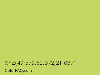 XYZ 49.579,61.372,21.037 Color is a light yellow color and the nearest color is June Bud #bdda57. Hex code #c5d763 and RGB value is rgb(197,215,99). In RGB color space, this color is composed of 77% red, 84% green, 39% blue, In CMYK color space, this color is composed of 8% cyan, 0% magenta, 54% yellow , 16% black , In HSL color space, this color has a hue angle of 69° , 59% saturation and 62% lightness.