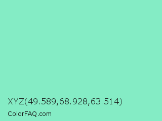 XYZ 49.589,68.928,63.514 Color is a light green color and the nearest color is Pearl Aqua #88d8c0. Hex code #84ecc5 and RGB value is rgb(132,236,197). In RGB color space, this color is composed of 52% red, 93% green, 77% blue, In CMYK color space, this color is composed of 44% cyan, 0% magenta, 17% yellow , 7% black , In HSL color space, this color has a hue angle of 158° , 73% saturation and 72% lightness.