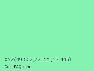 XYZ 49.602,72.221,53.445 Color is a light green color and the nearest color is Teal Deer #99e6b3. Hex code #84f3b2 and RGB value is rgb(132,243,178). In RGB color space, this color is composed of 52% red, 95% green, 70% blue, In CMYK color space, this color is composed of 46% cyan, 0% magenta, 27% yellow , 5% black , In HSL color space, this color has a hue angle of 145° , 82% saturation and 74% lightness.