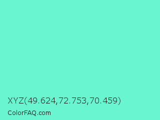 XYZ 49.624,72.753,70.459 Color is a light cyan color and the nearest color is Aquamarine #7fffd4. Hex code #68f5cf and RGB value is rgb(104,245,207). In RGB color space, this color is composed of 41% red, 96% green, 81% blue, In CMYK color space, this color is composed of 58% cyan, 0% magenta, 16% yellow , 4% black , In HSL color space, this color has a hue angle of 164° , 88% saturation and 68% lightness.