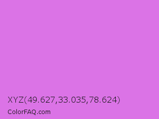 XYZ 49.627,33.035,78.624 Color is a light magenta color and the nearest color is Orchid #da70d6. Hex code #db73e6 and RGB value is rgb(219,115,230). In RGB color space, this color is composed of 86% red, 45% green, 90% blue, In CMYK color space, this color is composed of 5% cyan, 50% magenta, 0% yellow , 10% black , In HSL color space, this color has a hue angle of 294° , 70% saturation and 68% lightness.