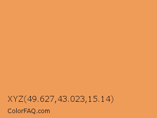 XYZ 49.627,43.023,15.14 Color is a light orange color and the nearest color is Tan Hide #fa9d5a. Hex code #f09c59 and RGB value is rgb(240,156,89). In RGB color space, this color is composed of 94% red, 61% green, 35% blue, In CMYK color space, this color is composed of 0% cyan, 35% magenta, 63% yellow , 6% black , In HSL color space, this color has a hue angle of 27° , 83% saturation and 65% lightness.