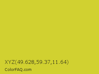 XYZ 49.628,59.37,11.64 Color is a normal yellow color and the nearest color is Pear #d1e231. Hex code #d1d130 and RGB value is rgb(209,209,48). In RGB color space, this color is composed of 82% red, 82% green, 19% blue, In CMYK color space, this color is composed of 0% cyan, 0% magenta, 77% yellow , 18% black , In HSL color space, this color has a hue angle of 60° , 64% saturation and 50% lightness.