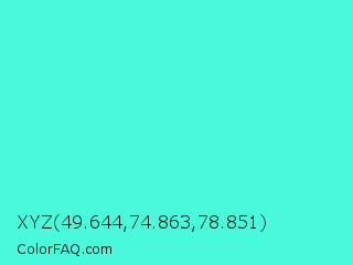 XYZ 49.644,74.863,78.851 Color is a light cyan color and the nearest color is Turquoise #40e0d0. Hex code #48fadb and RGB value is rgb(72,250,219). In RGB color space, this color is composed of 28% red, 98% green, 86% blue, In CMYK color space, this color is composed of 71% cyan, 0% magenta, 12% yellow , 2% black , In HSL color space, this color has a hue angle of 170° , 95% saturation and 63% lightness.