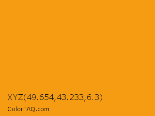 XYZ 49.654,43.233,6.3 Color is a normal orange color and the nearest color is Tree Poppy #fc9c1d. Hex code #f59c12 and RGB value is rgb(245,156,18). In RGB color space, this color is composed of 96% red, 61% green, 7% blue, In CMYK color space, this color is composed of 0% cyan, 36% magenta, 93% yellow , 4% black , In HSL color space, this color has a hue angle of 36° , 92% saturation and 52% lightness.