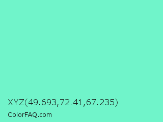 XYZ 49.693,72.41,67.235 Color is a light green color and the nearest color is Aquamarine #7fffd4. Hex code #70f4ca and RGB value is rgb(112,244,202). In RGB color space, this color is composed of 44% red, 96% green, 79% blue, In CMYK color space, this color is composed of 54% cyan, 0% magenta, 17% yellow , 4% black , In HSL color space, this color has a hue angle of 161° , 86% saturation and 70% lightness.