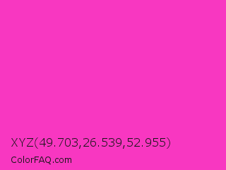 XYZ 49.703,26.539,52.955 Color is a normal magenta color and the nearest color is Razzle Dazzle Rose #ff33cc. Hex code #f837c1 and RGB value is rgb(248,55,193). In RGB color space, this color is composed of 97% red, 22% green, 76% blue, In CMYK color space, this color is composed of 0% cyan, 78% magenta, 22% yellow , 3% black , In HSL color space, this color has a hue angle of 317° , 93% saturation and 59% lightness.