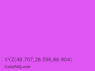 XYZ 49.707,28.596,86.904 Color is a light magenta color and the nearest color is Heliotrope #df73ff. Hex code #df55f2 and RGB value is rgb(223,85,242). In RGB color space, this color is composed of 87% red, 33% green, 95% blue, In CMYK color space, this color is composed of 8% cyan, 65% magenta, 0% yellow , 5% black , In HSL color space, this color has a hue angle of 293° , 86% saturation and 64% lightness.