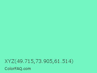 XYZ 49.715,73.905,61.514 Color is a light green color and the nearest color is Aquamarine #7fffd4. Hex code #72f7c0 and RGB value is rgb(114,247,192). In RGB color space, this color is composed of 45% red, 97% green, 75% blue, In CMYK color space, this color is composed of 54% cyan, 0% magenta, 22% yellow , 3% black , In HSL color space, this color has a hue angle of 155° , 89% saturation and 71% lightness.