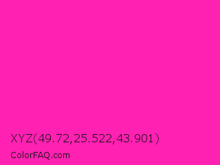 XYZ 49.72,25.522,43.901 Color is a normal magenta color and the nearest color is Persian Rose #fe28a2. Hex code #ff21b1 and RGB value is rgb(255,33,177). In RGB color space, this color is composed of 100% red, 13% green, 69% blue, In CMYK color space, this color is composed of 0% cyan, 87% magenta, 31% yellow , 0% black , In HSL color space, this color has a hue angle of 321° , 100% saturation and 56% lightness.