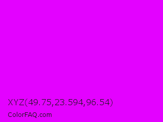 XYZ 49.75,23.594,96.54 Color is a normal magenta color and the nearest color is Phlox #df00ff. Hex code #e302ff and RGB value is rgb(227,2,255). In RGB color space, this color is composed of 89% red, 1% green, 100% blue, In CMYK color space, this color is composed of 11% cyan, 99% magenta, 0% yellow , 0% black , In HSL color space, this color has a hue angle of 293° , 100% saturation and 50% lightness.