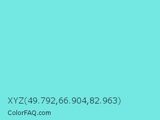 XYZ 49.792,66.904,82.963 Color is a light cyan color and the nearest color is Spray #79deec. Hex code #73e8e3 and RGB value is rgb(115,232,227). In RGB color space, this color is composed of 45% red, 91% green, 89% blue, In CMYK color space, this color is composed of 50% cyan, 0% magenta, 2% yellow , 9% black , In HSL color space, this color has a hue angle of 177° , 72% saturation and 68% lightness.