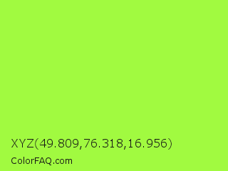 XYZ 49.809,76.318,16.956 Color is a light green color and the nearest color is French Lime #9efd38. Hex code #a1fa40 and RGB value is rgb(161,250,64). In RGB color space, this color is composed of 63% red, 98% green, 25% blue, In CMYK color space, this color is composed of 36% cyan, 0% magenta, 74% yellow , 2% black , In HSL color space, this color has a hue angle of 89° , 95% saturation and 62% lightness.