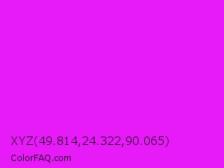 XYZ 49.814,24.322,90.065 Color is a normal magenta color and the nearest color is Phlox #df00ff. Hex code #e61bf7 and RGB value is rgb(230,27,247). In RGB color space, this color is composed of 90% red, 11% green, 97% blue, In CMYK color space, this color is composed of 7% cyan, 89% magenta, 0% yellow , 3% black , In HSL color space, this color has a hue angle of 295° , 93% saturation and 54% lightness.