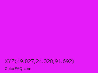 XYZ 49.827,24.328,91.692 Color is a normal magenta color and the nearest color is Phlox #df00ff. Hex code #e51cf9 and RGB value is rgb(229,28,249). In RGB color space, this color is composed of 90% red, 11% green, 98% blue, In CMYK color space, this color is composed of 8% cyan, 89% magenta, 0% yellow , 2% black , In HSL color space, this color has a hue angle of 295° , 95% saturation and 54% lightness.