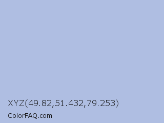 XYZ 49.82,51.432,79.253 Color is a light blue color and the nearest color is Light Steel Blue #b0c4de. Hex code #afbee2 and RGB value is rgb(175,190,226). In RGB color space, this color is composed of 69% red, 75% green, 89% blue, In CMYK color space, this color is composed of 23% cyan, 16% magenta, 0% yellow , 11% black , In HSL color space, this color has a hue angle of 222° , 47% saturation and 79% lightness.