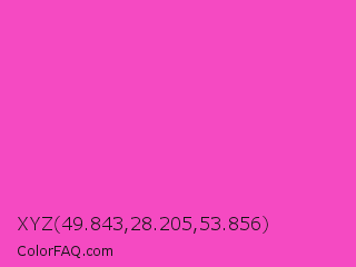 XYZ 49.843,28.205,53.856 Color is a light magenta color and the nearest color is Light Deep Pink #ff5ccd. Hex code #f54ac2 and RGB value is rgb(245,74,194). In RGB color space, this color is composed of 96% red, 29% green, 76% blue, In CMYK color space, this color is composed of 0% cyan, 70% magenta, 21% yellow , 4% black , In HSL color space, this color has a hue angle of 318° , 90% saturation and 63% lightness.