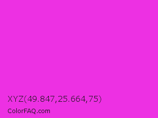 XYZ 49.847,25.664,75 Color is a normal magenta color and the nearest color is Razzle Dazzle Rose #ff33cc. Hex code #ed30e3 and RGB value is rgb(237,48,227). In RGB color space, this color is composed of 93% red, 19% green, 89% blue, In CMYK color space, this color is composed of 0% cyan, 80% magenta, 4% yellow , 7% black , In HSL color space, this color has a hue angle of 303° , 84% saturation and 56% lightness.