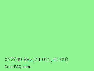 XYZ 49.882,74.011,40.09 Color is a light green color and the nearest color is Light Green #90ee90. Hex code #90f695 and RGB value is rgb(144,246,149). In RGB color space, this color is composed of 56% red, 96% green, 58% blue, In CMYK color space, this color is composed of 41% cyan, 0% magenta, 39% yellow , 4% black , In HSL color space, this color has a hue angle of 123° , 85% saturation and 76% lightness.