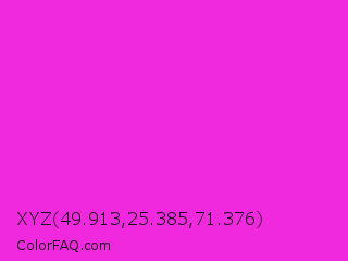 XYZ 49.913,25.385,71.376 Color is a normal magenta color and the nearest color is Hot Magenta #ff1dce. Hex code #f029de and RGB value is rgb(240,41,222). In RGB color space, this color is composed of 94% red, 16% green, 87% blue, In CMYK color space, this color is composed of 0% cyan, 83% magenta, 8% yellow , 6% black , In HSL color space, this color has a hue angle of 305° , 87% saturation and 55% lightness.