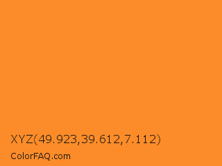 XYZ 49.923,39.612,7.112 Color is a normal orange color and the nearest color is Princeton Orange #f58025. Hex code #fc8c29 and RGB value is rgb(252,140,41). In RGB color space, this color is composed of 99% red, 55% green, 16% blue, In CMYK color space, this color is composed of 0% cyan, 44% magenta, 84% yellow , 1% black , In HSL color space, this color has a hue angle of 28° , 97% saturation and 57% lightness.