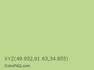XYZ 49.932,61.63,34.855 Color is a light green color and the nearest color is Medium Spring Bud #c9dc87. Hex code #bbd88e and RGB value is rgb(187,216,142). In RGB color space, this color is composed of 73% red, 85% green, 56% blue, In CMYK color space, this color is composed of 13% cyan, 0% magenta, 34% yellow , 15% black , In HSL color space, this color has a hue angle of 84° , 49% saturation and 70% lightness.