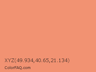 XYZ 49.934,40.65,21.134 Color is a light color and the nearest color is Apricot #eb9373. Hex code #f29272 and RGB value is rgb(242,146,114). In RGB color space, this color is composed of 95% red, 57% green, 45% blue, In CMYK color space, this color is composed of 0% cyan, 40% magenta, 53% yellow , 5% black , In HSL color space, this color has a hue angle of 15° , 83% saturation and 70% lightness.
