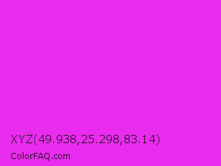 XYZ 49.938,25.298,83.14 Color is a normal magenta color and the nearest color is Razzle Dazzle Rose #ff33cc. Hex code #e92cee and RGB value is rgb(233,44,238). In RGB color space, this color is composed of 91% red, 17% green, 93% blue, In CMYK color space, this color is composed of 2% cyan, 82% magenta, 0% yellow , 7% black , In HSL color space, this color has a hue angle of 298° , 85% saturation and 55% lightness.