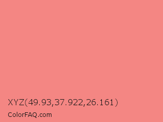 XYZ 49.93,37.922,26.161 Color is a light red color and the nearest color is Light Coral #f08080. Hex code #f48683 and RGB value is rgb(244,134,131). In RGB color space, this color is composed of 96% red, 53% green, 51% blue, In CMYK color space, this color is composed of 0% cyan, 45% magenta, 46% yellow , 4% black , In HSL color space, this color has a hue angle of 2° , 84% saturation and 74% lightness.