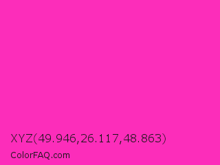 XYZ 49.946,26.117,48.863 Color is a normal magenta color and the nearest color is Razzle Dazzle Rose #ff33cc. Hex code #fc2dba and RGB value is rgb(252,45,186). In RGB color space, this color is composed of 99% red, 18% green, 73% blue, In CMYK color space, this color is composed of 0% cyan, 82% magenta, 26% yellow , 1% black , In HSL color space, this color has a hue angle of 319° , 97% saturation and 58% lightness.