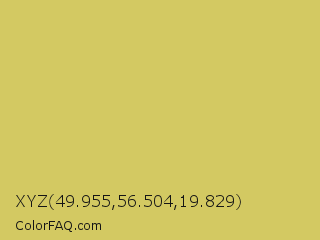 XYZ 49.955,56.504,19.829 Color is a light yellow color and the nearest color is Tacha #d6c562. Hex code #d3c962 and RGB value is rgb(211,201,98). In RGB color space, this color is composed of 83% red, 79% green, 38% blue, In CMYK color space, this color is composed of 0% cyan, 5% magenta, 54% yellow , 17% black , In HSL color space, this color has a hue angle of 55° , 56% saturation and 61% lightness.
