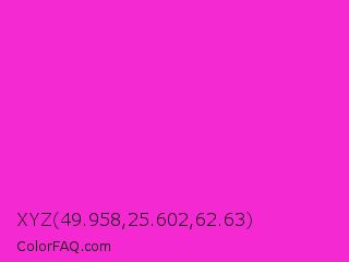 XYZ 49.958,25.602,62.63 Color is a normal magenta color and the nearest color is Razzle Dazzle Rose #ff33cc. Hex code #f529d1 and RGB value is rgb(245,41,209). In RGB color space, this color is composed of 96% red, 16% green, 82% blue, In CMYK color space, this color is composed of 0% cyan, 83% magenta, 15% yellow , 4% black , In HSL color space, this color has a hue angle of 311° , 91% saturation and 56% lightness.