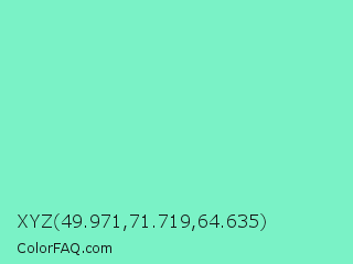 XYZ 49.971,71.719,64.635 Color is a light green color and the nearest color is Aquamarine #7fffd4. Hex code #7af2c6 and RGB value is rgb(122,242,198). In RGB color space, this color is composed of 48% red, 95% green, 78% blue, In CMYK color space, this color is composed of 50% cyan, 0% magenta, 18% yellow , 5% black , In HSL color space, this color has a hue angle of 158° , 82% saturation and 71% lightness.