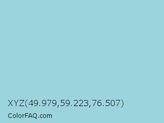 XYZ 49.979,59.223,76.507 Color is a light cyan color and the nearest color is Aqua Island #a1dad7. Hex code #9bd4dc and RGB value is rgb(155,212,220). In RGB color space, this color is composed of 61% red, 83% green, 86% blue, In CMYK color space, this color is composed of 30% cyan, 4% magenta, 0% yellow , 14% black , In HSL color space, this color has a hue angle of 187° , 48% saturation and 74% lightness.