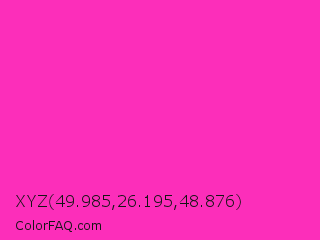XYZ 49.985,26.195,48.876 Color is a normal magenta color and the nearest color is Razzle Dazzle Rose #ff33cc. Hex code #fc2eba and RGB value is rgb(252,46,186). In RGB color space, this color is composed of 99% red, 18% green, 73% blue, In CMYK color space, this color is composed of 0% cyan, 82% magenta, 26% yellow , 1% black , In HSL color space, this color has a hue angle of 319° , 97% saturation and 58% lightness.