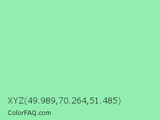 XYZ 49.989,70.264,51.485 Color is a light green color and the nearest color is Teal Deer #99e6b3. Hex code #91eeaf and RGB value is rgb(145,238,175). In RGB color space, this color is composed of 57% red, 93% green, 69% blue, In CMYK color space, this color is composed of 39% cyan, 0% magenta, 26% yellow , 7% black , In HSL color space, this color has a hue angle of 139° , 73% saturation and 75% lightness.