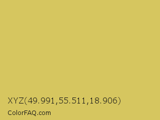 XYZ 49.991,55.511,18.906 Color is a light yellow color and the nearest color is Tacha #d6c562. Hex code #d6c65f and RGB value is rgb(214,198,95). In RGB color space, this color is composed of 84% red, 78% green, 37% blue, In CMYK color space, this color is composed of 0% cyan, 7% magenta, 56% yellow , 16% black , In HSL color space, this color has a hue angle of 52° , 59% saturation and 61% lightness.