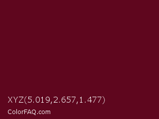 XYZ 5.019,2.657,1.477 Color is a very dark rose color and the nearest color is Bordeaux #5c0120. Hex code #5f061e and RGB value is rgb(95,6,30). In RGB color space, this color is composed of 37% red, 2% green, 12% blue, In CMYK color space, this color is composed of 0% cyan, 94% magenta, 68% yellow , 63% black , In HSL color space, this color has a hue angle of 344° , 88% saturation and 20% lightness.