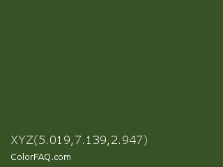 XYZ 5.019,7.139,2.947 Color is a dark green color and the nearest color is Mughal Green #306030. Hex code #375326 and RGB value is rgb(55,83,38). In RGB color space, this color is composed of 22% red, 33% green, 15% blue, In CMYK color space, this color is composed of 34% cyan, 0% magenta, 54% yellow , 67% black , In HSL color space, this color has a hue angle of 97° , 37% saturation and 24% lightness.