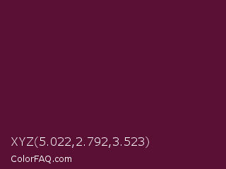 XYZ 5.022,2.792,3.523 Color is a very dark rose color and the nearest color is Mulberry Wood #5c0536. Hex code #5a1034 and RGB value is rgb(90,16,52). In RGB color space, this color is composed of 35% red, 6% green, 20% blue, In CMYK color space, this color is composed of 0% cyan, 82% magenta, 42% yellow , 65% black , In HSL color space, this color has a hue angle of 331° , 70% saturation and 21% lightness.