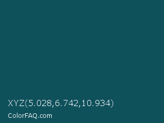 XYZ 5.028,6.742,10.934 Color is a very dark cyan color and the nearest color is Deep Sea Green #095859. Hex code #0f515b and RGB value is rgb(15,81,91). In RGB color space, this color is composed of 6% red, 32% green, 36% blue, In CMYK color space, this color is composed of 84% cyan, 11% magenta, 0% yellow , 64% black , In HSL color space, this color has a hue angle of 188° , 72% saturation and 21% lightness.