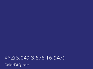 XYZ 5.049,3.576,16.947 Color is a normal blue color and the nearest color is St Patricks Blue #23297a. Hex code #2b2c74 and RGB value is rgb(43,44,116). In RGB color space, this color is composed of 17% red, 17% green, 45% blue, In CMYK color space, this color is composed of 63% cyan, 62% magenta, 0% yellow , 55% black , In HSL color space, this color has a hue angle of 239° , 46% saturation and 31% lightness.