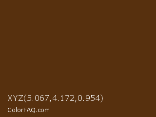 XYZ 5.067,4.172,0.954 Color is a very dark orange color and the nearest color is Jambalaya #5b3013. Hex code #57300e and RGB value is rgb(87,48,14). In RGB color space, this color is composed of 34% red, 19% green, 5% blue, In CMYK color space, this color is composed of 0% cyan, 45% magenta, 84% yellow , 66% black , In HSL color space, this color has a hue angle of 28° , 72% saturation and 20% lightness.