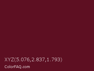XYZ 5.076,2.837,1.793 Color is a very dark red color and the nearest color is Bordeaux #5c0120. Hex code #5e0f22 and RGB value is rgb(94,15,34). In RGB color space, this color is composed of 37% red, 6% green, 13% blue, In CMYK color space, this color is composed of 0% cyan, 84% magenta, 64% yellow , 63% black , In HSL color space, this color has a hue angle of 346° , 72% saturation and 21% lightness.