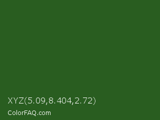 XYZ 5.09,8.404,2.72 Color is a dark green color and the nearest color is Mughal Green #306030. Hex code #295d20 and RGB value is rgb(41,93,32). In RGB color space, this color is composed of 16% red, 36% green, 13% blue, In CMYK color space, this color is composed of 56% cyan, 0% magenta, 66% yellow , 64% black , In HSL color space, this color has a hue angle of 111° , 49% saturation and 25% lightness.