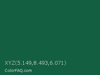 XYZ 5.149,8.493,6.071 Color is a very dark green color and the nearest color is Green Pea #1d6142. Hex code #125e3f and RGB value is rgb(18,94,63). In RGB color space, this color is composed of 7% red, 37% green, 25% blue, In CMYK color space, this color is composed of 81% cyan, 0% magenta, 33% yellow , 63% black , In HSL color space, this color has a hue angle of 156° , 68% saturation and 22% lightness.