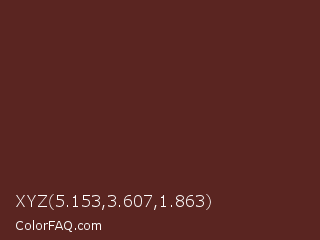 XYZ 5.153,3.607,1.863 Color is a dark red color and the nearest color is Caput Mortuum #592720. Hex code #5a2521 and RGB value is rgb(90,37,33). In RGB color space, this color is composed of 35% red, 15% green, 13% blue, In CMYK color space, this color is composed of 0% cyan, 59% magenta, 63% yellow , 65% black , In HSL color space, this color has a hue angle of 4° , 46% saturation and 24% lightness.