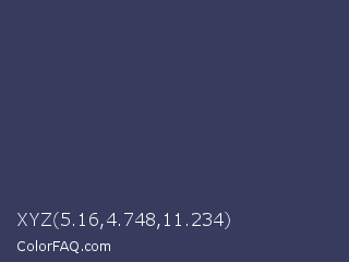 XYZ 5.16,4.748,11.234 Color is a dark blue color and the nearest color is Rhino #2e3f62. Hex code #373b5e and RGB value is rgb(55,59,94). In RGB color space, this color is composed of 22% red, 23% green, 37% blue, In CMYK color space, this color is composed of 41% cyan, 37% magenta, 0% yellow , 63% black , In HSL color space, this color has a hue angle of 234° , 26% saturation and 29% lightness.