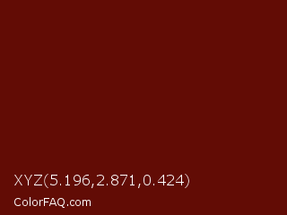 XYZ 5.196,2.871,0.424 Color is a very dark red color and the nearest color is Dark Tan #661010. Hex code #620c05 and RGB value is rgb(98,12,5). In RGB color space, this color is composed of 38% red, 5% green, 2% blue, In CMYK color space, this color is composed of 0% cyan, 88% magenta, 95% yellow , 62% black , In HSL color space, this color has a hue angle of 5° , 90% saturation and 20% lightness.